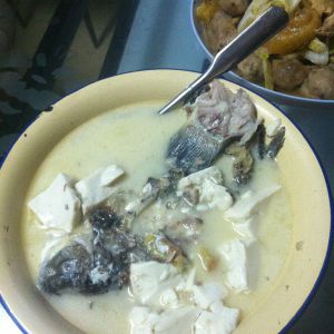 一块钱买回来的豆腐就够了,要把姜拍扁,豆腐切块,鱼煎5分钟就好了,之后放水放姜放豆腐,盖上盖子,把火开到大中火