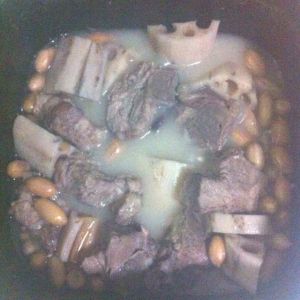 莲藕切大块(千万不要切成藕片哦~)然后把焯过的骨头 泡过的花生 和切好的藕片 一齐放进加了姜片的倒了水的锅里