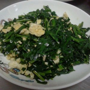 往锅里加油,待油热后,放入韭菜,翻炒。