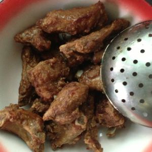 接着捞出排骨,趁热吃最好吃。若要继续炸记得要热油。