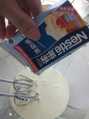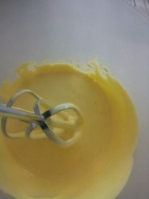 蛋黄四枚,加所用量1/3白糖打发,打啊打~打至变白~