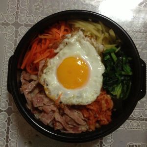 取一个石锅,在里面涂抹上一层香油,然后取适量的米饭,平铺在锅底。米饭上依次码上处理好的胡萝卜丝、土豆丝、培根丝、泡菜丝、菠菜。将装满东西的石锅放到火上,开小火慢慢加热。趁这功夫我们就可以加工鸡蛋啦~鸡蛋就是煎成最普通的荷包蛋,可以吃唐黄的最好弄成唐黄,这样拌饭时蛋液拌在米饭中,特别好吃。