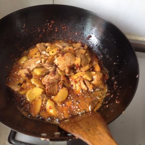 当肉片 、土豆都呈鲜亮红色时 ,加入一点点盐 (因为辣椒酱是有味道的)翻炒几下 出锅