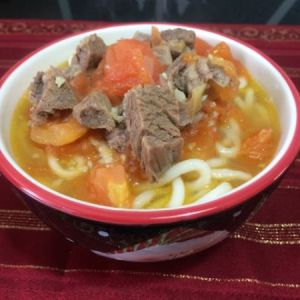 锵锵锵!把面条盛到碗里加入牛肉汤。剩下的牛肉汤和生面条可以冻起来,下次吃时面条不要解冻,直接下到热水里,和新面条一样