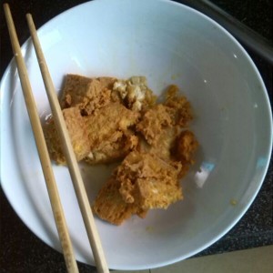 豆腐切块,倒半瓶臭豆腐汤,再加水没过豆腐浸泡2小时