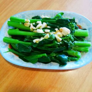 煮熟出锅,加入蒜头,蒸鱼油,锅里烧热油,淋在芥兰上