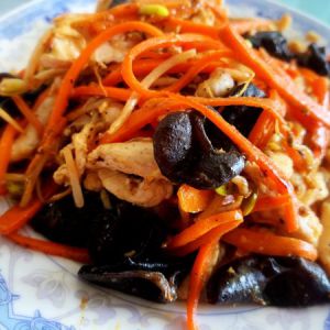 准备食材,胡萝卜切丝,黑木耳泡发后切丝(我用的昨天炒菜剩下的)、豆芽洗干净沥干、姜片切片、鸡胸肉切丝