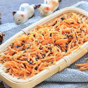 翻炒至鸡丝水分收干,大约8分钟,再撒上紫菜碎和白芝麻,就可以盛出碗中享用了。
