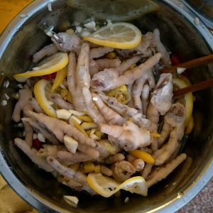煮好,出锅,放冷白开水过凉鸡爪。一般换两次水