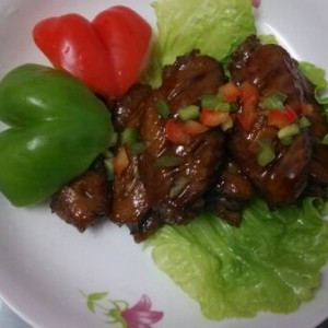 锅里稍微留点油,将姜丝放入,桂皮八角适量(好吧,开始忘记写了)炒香之后放入炸好的鸡翅,翻炒一下,也可加几粒干红尖椒(好吧,又忘记个),翻炒一下而后将非无糖可乐倒入锅中,刚好淹没鸡翅,先小火炖十来分钟,之后大火加快收汁。之后用筷子将鸡翅夹出盘装食用即可。最后成果如图,我的可乐鸡翅首秀,我的食客们表示,首秀还不错,味道很正哦!!