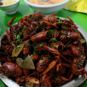 下姜大蒜,桂皮,八角,花椒,辣椒配料爆香,然后下炸好的虾