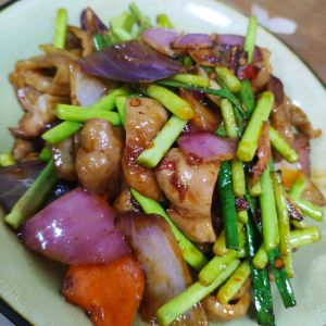 准备配菜:蒜薹,洋葱,红萝卜。