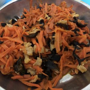 猪肉洗干净切丝,加入蚝油鸡精盐调味