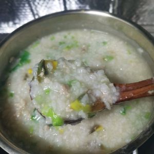 熬到这种程度,下入肉馅,再煮五分钟,下入切好的皮蛋块儿