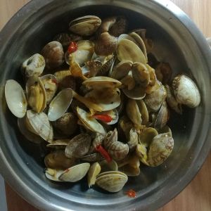 放花蛤,加料酒,个人觉得别放太多,味太足了。翻遍几下,花蛤口微微张开的时候,加生抽、糖,加少许水,翻炒至花蛤开口。