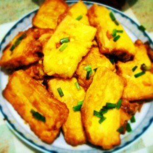 煎一会翻身,直到豆腐两边都金黄,盛出
