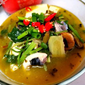 铁锅烧热,放菜籽油适量,冒烟后,放酸菜及姜、麻椒、辣椒等配料,翻炒3分钟(一定要够时间),然后放入高汤(或清水)。