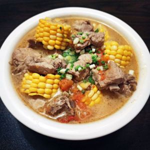 大火煮沸后,倒入玉米,再调大火煮沸,然后转小火再炖四五十分钟。