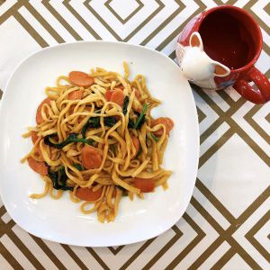 最后放入面条 翻炒 调入糖 这里我没有加盐 因为生抽中本来就有盐分 (我家比较喜欢甜甜咸咸的炒面 大家可以根据自己的口味加调味料)