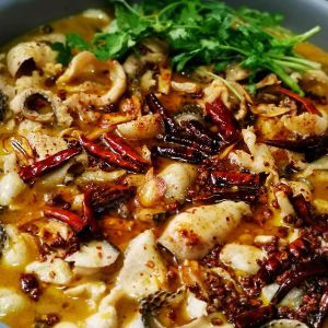鱼煮熟后连同汤汁一起盖在酸菜上面,表面撒上干辣椒粉,另起锅烧油,把蒜片、花椒、干辣椒爆香