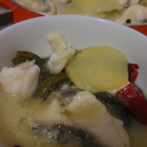 炒到有味道出来后,倒水,下鱼骨头先煲着,中间滚的时候,把边边那些沫沫捞走。继续煮个十来分钟下盐,鸡精去调味,再慢慢把鱼肉放进去,不要太大力搅动以免鱼肉全散了。然后等下放入土豆片。