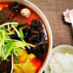 鸭血取出洗净,切5mm厚片,火腿切片,油豆皮切条,鹌鹑蛋去皮,木耳泡发,牛百叶洗净