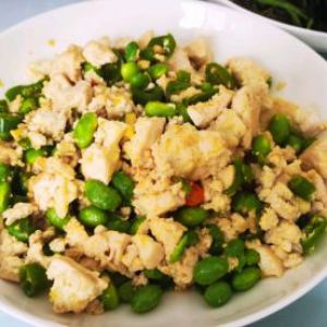 起油锅,煸毛豆,闷烂,盛起,备用。