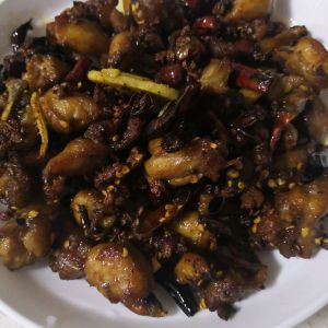 热锅冷油,调料全部下锅,炒香后下焦黄鸡块翻炒三四分钟,加点盐和鸡精,再翻炒几下即可出锅。