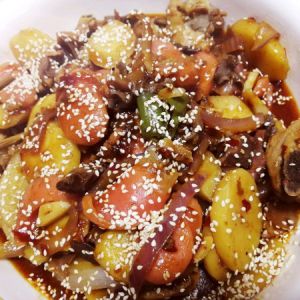 4,调味,导入郫县豆瓣酱3勺,黄豆酱2勺,盐,味精,鸡精,料酒,糖2勺。翻炒后加水小碗水。闷熟即可。起锅撒点葱花芝麻随意。