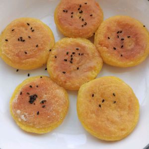 平底锅倒油小火慢慢煎两面黄,小饼鼓起,撒点黑芝麻起锅,南瓜浓厚的香气扑鼻而来。
