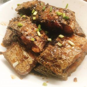 倒入小半碗水,然后盖上盖子中小火煮,中间给带鱼翻个面,继续让它收汁