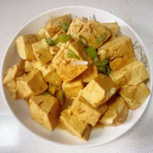 豆腐切块,准备好葱花、姜片、两瓣大料,一撮花椒、麻椒备用。