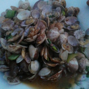 过一会儿后把准备好的花蛤倒进去 翻炒几遍 加入一勺子辣酱 再翻炒几次