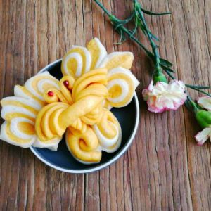 第二种蝴蝶造型相对简单。试用配方外的白色面团和黄色面团各一份,擀成大小一致长方形叠放,卷起留边然后切片,每两片一组,用筷子一夹即可。