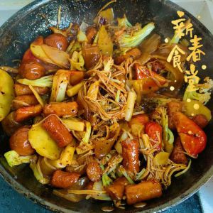 蔬菜加入锅中,和宽粉一起煮至开锅,开锅后再继续煮5分钟后捞出。