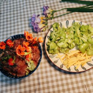 猪肉、青椒、姜切好备用。肉用小粉和酱油拌匀。