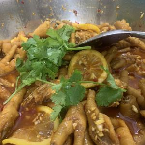 第一步先将鸡指甲剪去,鸡爪对半开,然后冷水下锅,放姜片,香叶八角,料酒,煮熟,捞出过冷水,沥干水分备用,