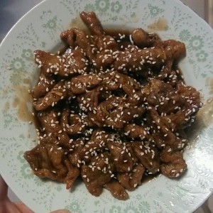 锅中放少量油,下入葱姜炒出香味,再倒入调好的料汁,用大火熬开,待发出香味时,倒入炸好的肉片翻炒。当料汁均匀的裹住肉片时,调入少许水淀粉将汤汁收浓,然后就可以出锅装盘了,最后还可以洒上些芝麻点缀!