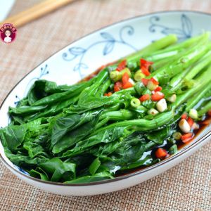 剥下芥兰的叶片,粗茎底部的老皮削掉,为便于入味也可纵剖两半;