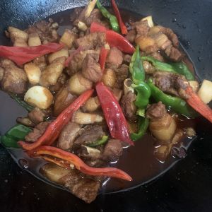 两斤肉,一块生姜切好,一点醋,2锅铲生抽,四分之三锅铲老抽,2个干辣椒,一袋子加一点老酒。大火煮开