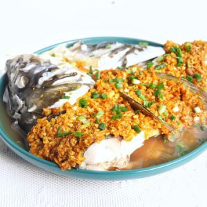 鱼头蒸好后取出,将热油均匀淋至鱼头表面即可。