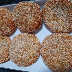 分成一个个的剂子,放掌心揉圆再拍扁,然后粘上事先准备的白芝麻就成了这个样子了