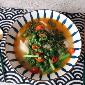 锅中热油爆香花椒,辣椒和小葱倒入鱼上