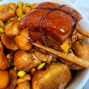 五花肉切段,为防止松散,用线绳十字纹捆绑,倒放在最上层。