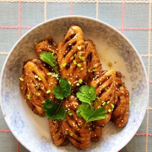 起锅装盘,撒上白芝麻(熟)、香菜,制作完成。