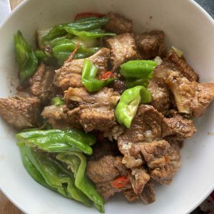 放入葱段,小米辣,青椒,盐,翻炒一会,出锅。