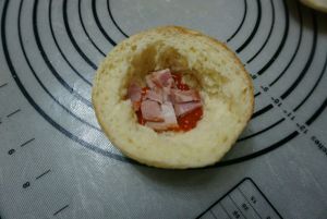 在汉堡坯下面一层,取出一些面包瓤,加入披萨酱,切好的培根!