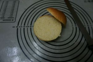 凉透的汉堡坯,用刀切开!注意切的时候上半部分少留,下半部分多留一些!培根切成小块,香葱洗干净切碎!