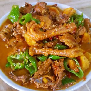闷制半小时,期间可以翻炒,而且不能让水干了…加入青辣椒进行翻炒,最后一定要留些汤汁,要下宽叶面吃…
