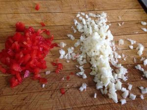 蒜和红柿子椒切碎;